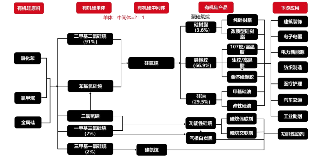 有机硅行业产业链主要为“有机硅原料——有机硅单体——有机硅中间体——有机硅产品”。经合成得到的混合甲基单体通过精镏分离、水解、裂解等过程生成有机硅基础聚合物,再进步加工生产各种有机硅产品。