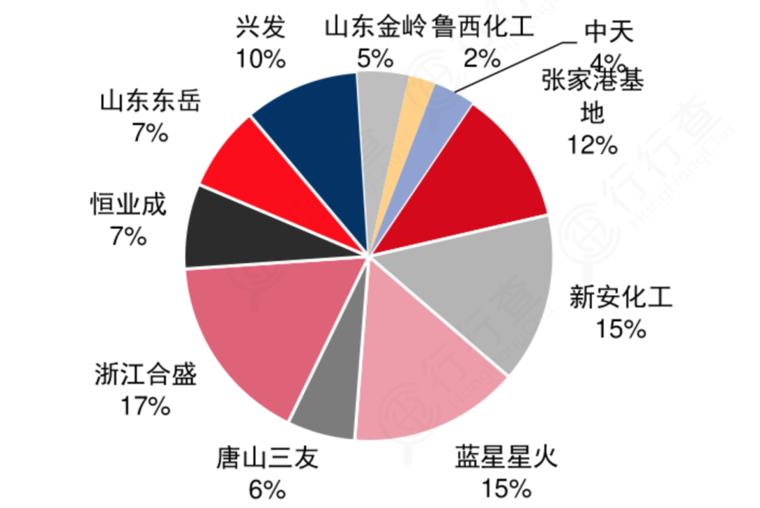 单体产能超过90%分布在头部的10家企业,市场集中度高,议价能力强。但是龙头之间产能差距较小,当前行业内无绝对规模垄断龙头。