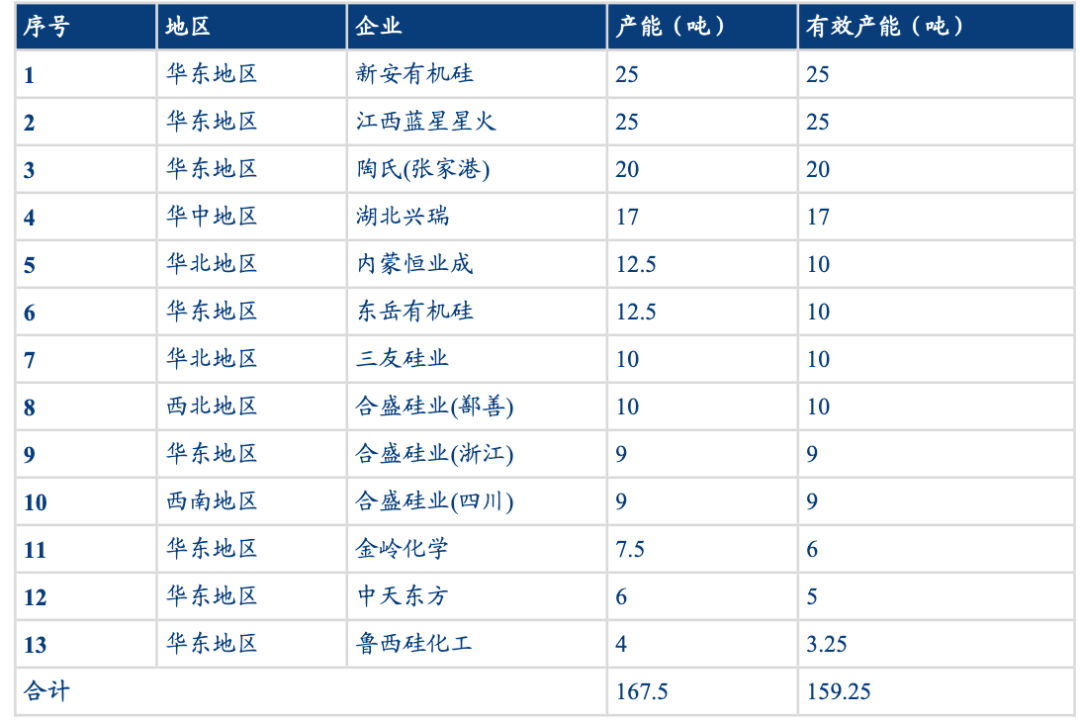 新安化工有机硅单体的产能达34万吨/年,仅次于信越,占全球产能的比重达6.16%,东岳硅材、内蒙古恒业成有机硅单体产能达25万吨/年,占全球的比重为4.53%,三友化工和兴发集团的有机硅单体产能也达到了20万吨/年,占全球产能比重达3.62%。2020年新增湖北兴发和新安化工共30万吨/年有机硅单体(折合DMC15万吨/年),增长约10%。预计2021-2022年将陆续有约180万吨/年有机硅单体投产,国内有机硅总产能将在现有基础上扩大54%。